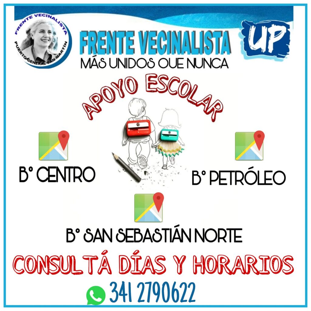 El Frente Vecinalista PGSM tiene su local en calle Guillermo Kirk 426 y pone a disposición de los interesados un número de teléfono para consultar sobre los días y horarios de las clases de apoyo escolar.