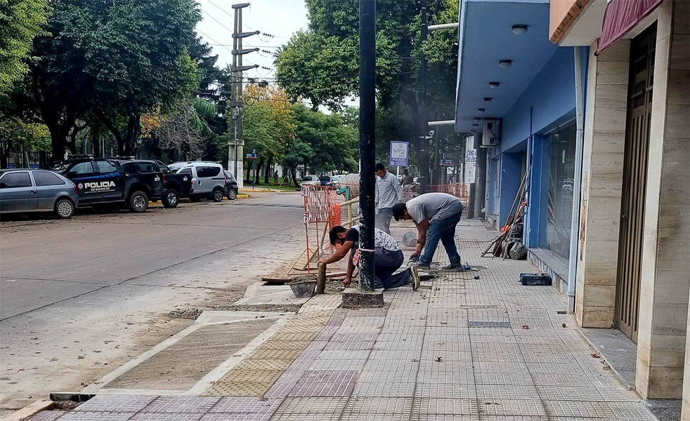 Por otro lado se realiza la renovación y nivelación de veredas con nuevo embaldosado granítico bi-color, la colocación de bolardos lumínicos en bocacalles, y la renovación y reubicación de arbolado público.