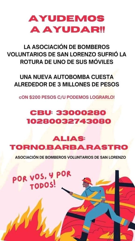 Por otra parte, Bomberos Voluntarios de la ciudad de San Lorenzo pusieron en marcha una campaña solidaria para la compra de una autobomba.