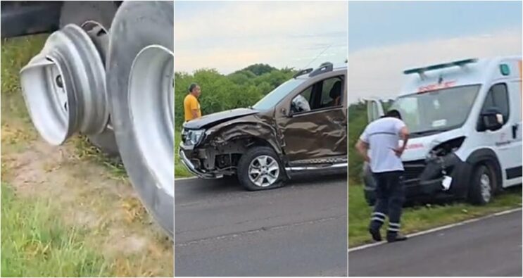 En el lugar, una Renault Duster chocó contra un camión, lo que provocó que una de las ruedas del acoplado se desprendió y voló hacia la ambulancia que venía detrás, impactando directamente contra el vehículo de emergencia.
