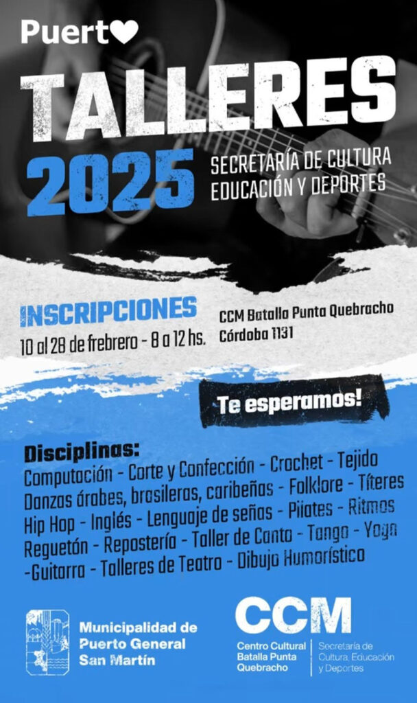 Del 10 al 28 de febrero se llevan adelante en el Centro Cultural Municipal “Batalla de Punta Quebracho” las inscripciones al ciclo 2025 de los talleres y disciplinas que dicta personal de la Secretaría de Cultura, Educación y Deportes dependiente de la Municipalidad de Puerto General San Martín.