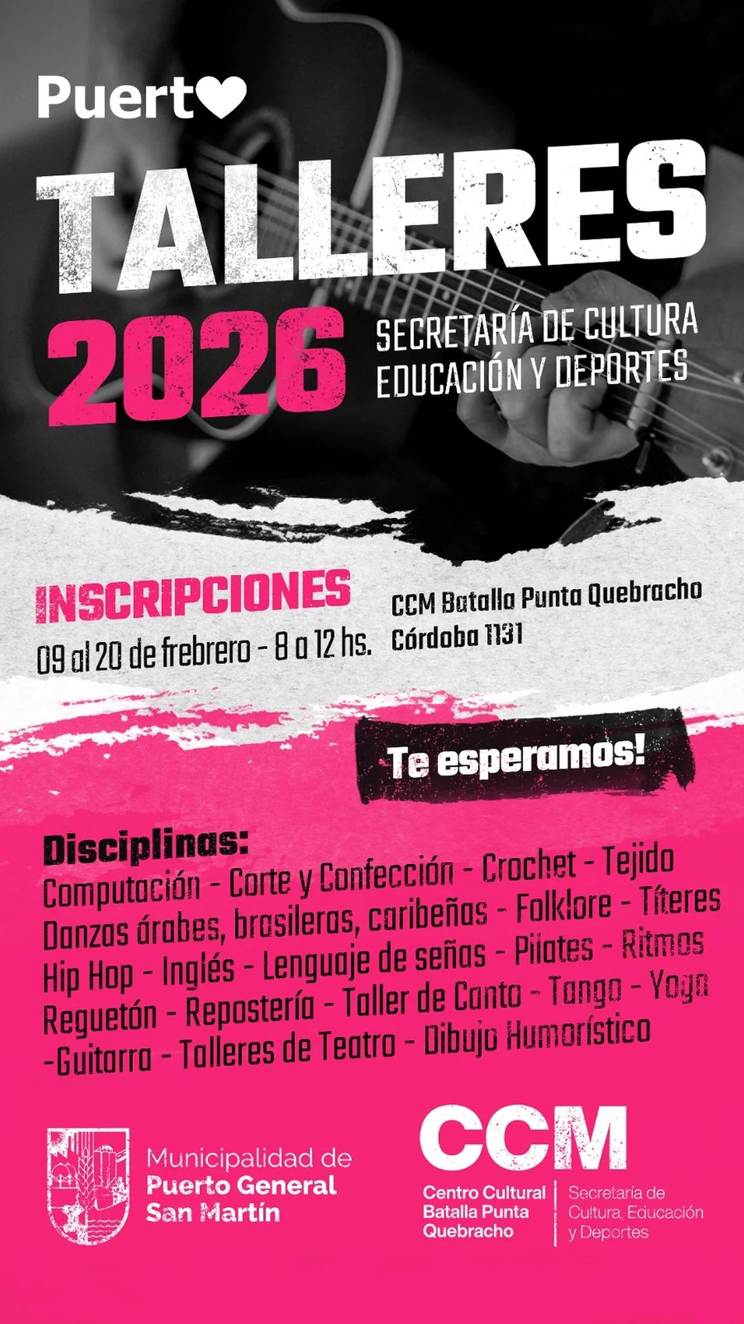 Del 9 al 20 de febrero se realizarán en el Centro Cultural Municipal “Batalla de Punta Quebracho” las inscripciones al ciclo 2026 de los talleres y disciplinas que dicta personal de la Secretaría de Cultura, Educación y Deportes dependiente de la Municipalidad de Puerto General San Martín.