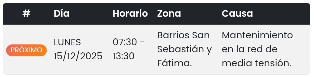 Los barrios afectados por el corte serán San Sebastián y Fátima.