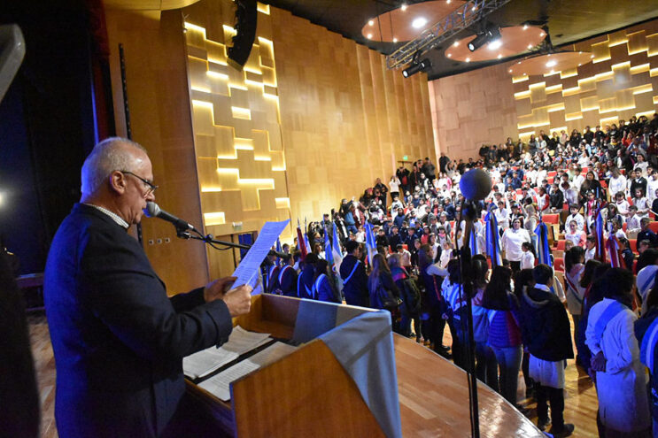 Luego, con mucha emoción, el primer mandatario de la ciudad les tomó juramento a la bandera a los estudiantes de la ciudad: “Alumnos, ¿Prometen defenderla, respetarla, y amarla con fraterna tolerancia y respeto, estudiando con firme voluntad , comprometiéndose a ser ciudadanos humildes y justos, aceptando solidariamente en sus diferencias a todos los que pueblan nuestro suelo y transmitiendo en todos y cada uno de nuestros actos sus valores permanentemente, e irrenunciables?”. Y la respuesta, en un grito emotivo, fue: “¡Si, prometo!”, respondieron todos para cerrar con aplausos.