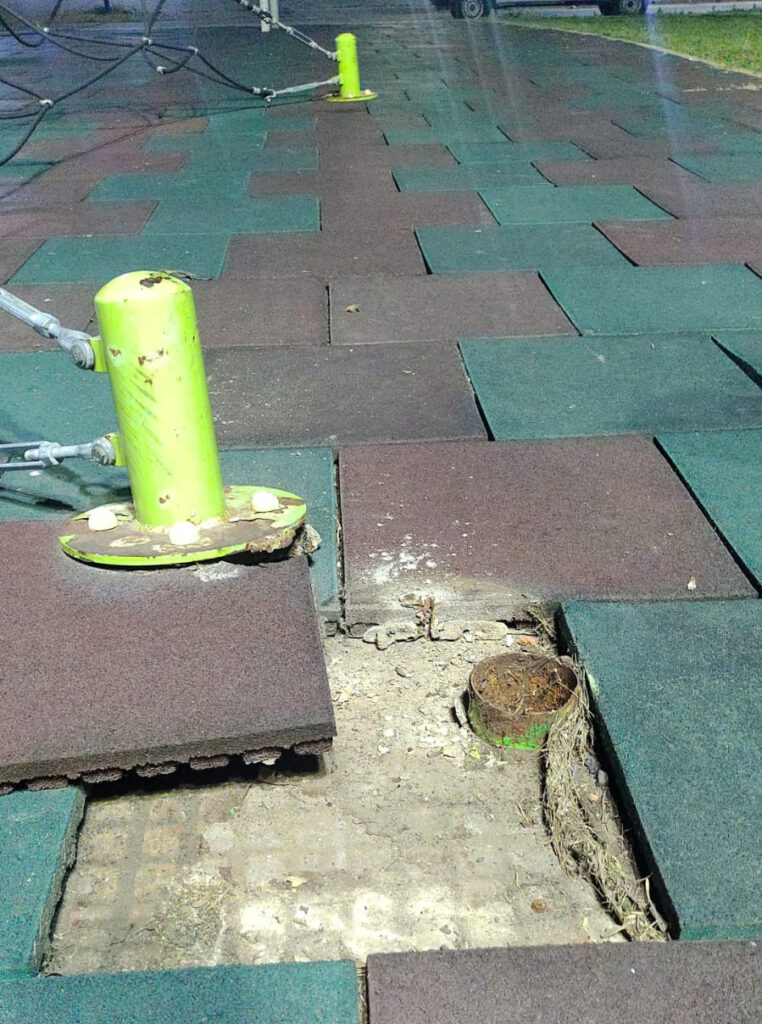 En tanto, un sector de los juegos del Circuito Aeróbico fue vandalizado con la rotura de parte del piso y mobiliario que protege de golpes a los chicos que lo utilizan diariamente.