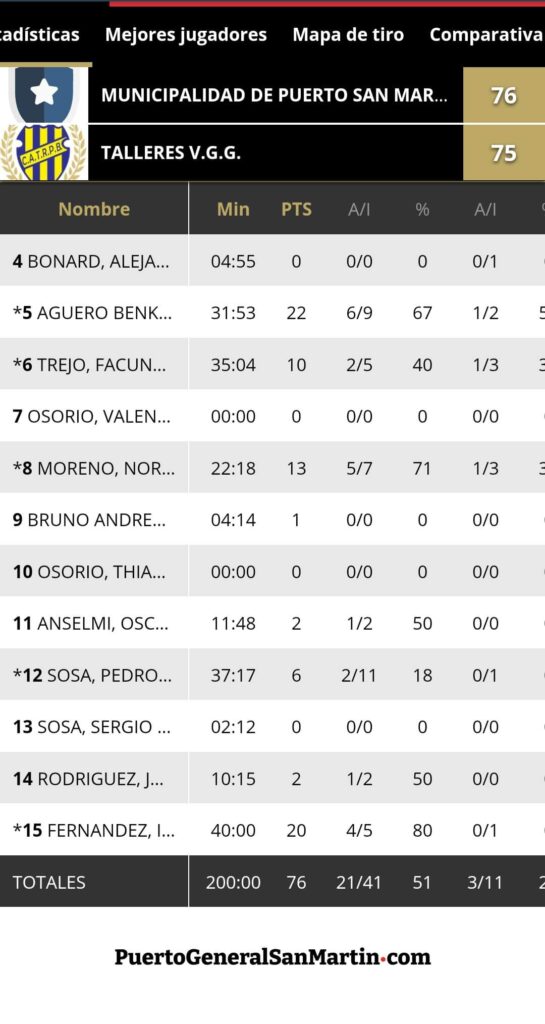 En tanto, para el visitante hizo 24 puntos Esteban Pérez y con 10 se anotaron Agustín García, Valentín Cuevas, Tomás Ianelli y Bruno Giacomini.