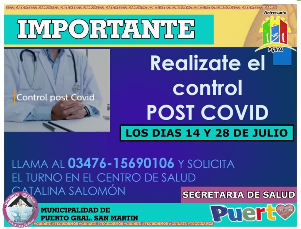 La Secretaría de Salud Municipal realizará controles post-covid durante el mes de Julio en el Centro de Atención Primaria “Catalina Salomón” de Puerto General San Martín.