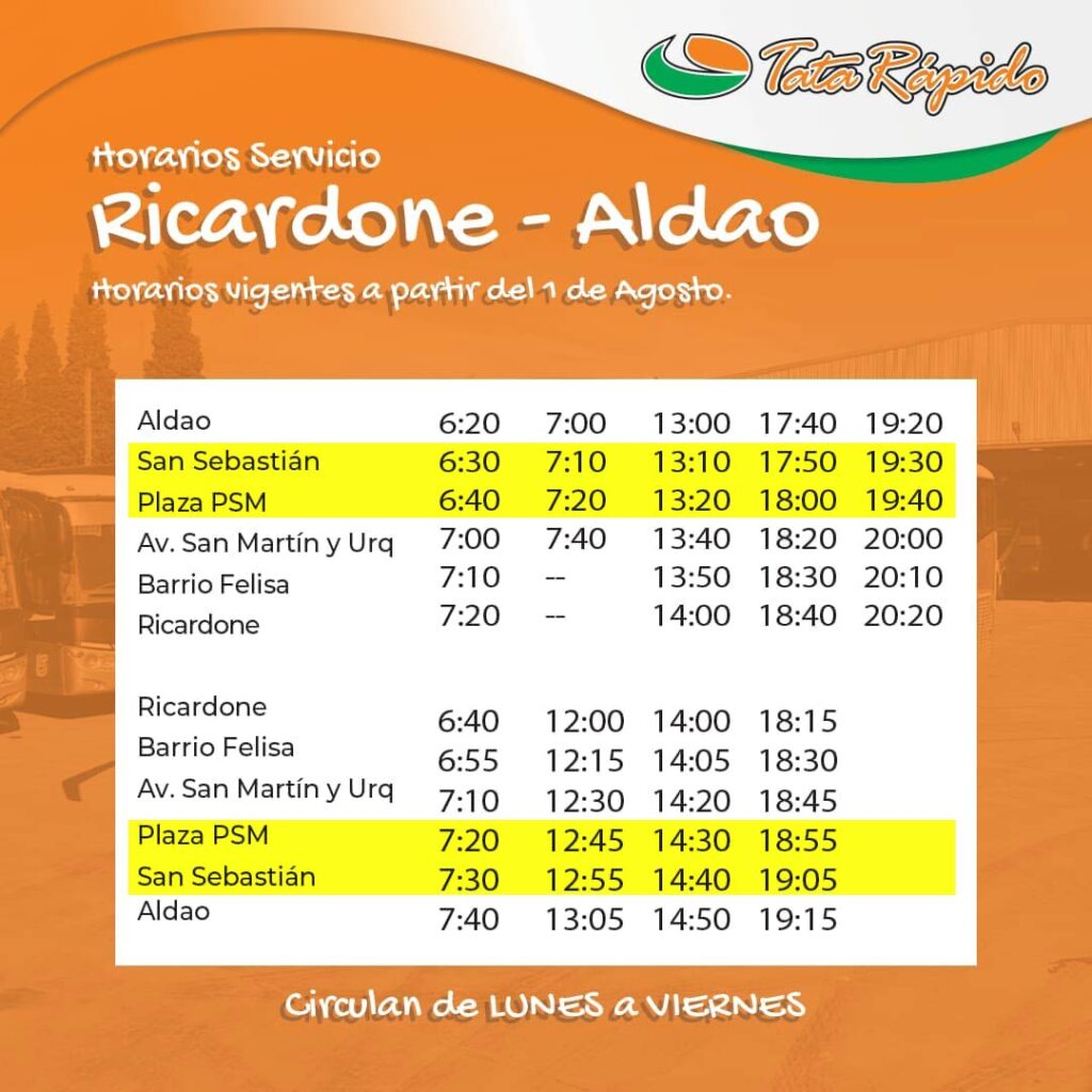 Respondiendo a los pedidos de la gente y luego de varias reuniones entre autoridades municipales y comunales de la región, la empresa de transporte de pasajeros Tata Rápido modificó los horarios de su recorrido interurbano entre Ricardone y Aldao.