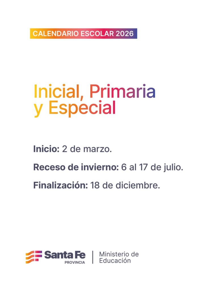 El ministro de Educación de Santa Fe, José Goity, anunció este miércoles el calendario escolar 2026 que iniciará el 2 de marzo, tendrá receso invernal del 6 al 17 de julio y finalizará el 18 de diciembre tanto en el nivel Inicial, como Primario y Especial (IPE).