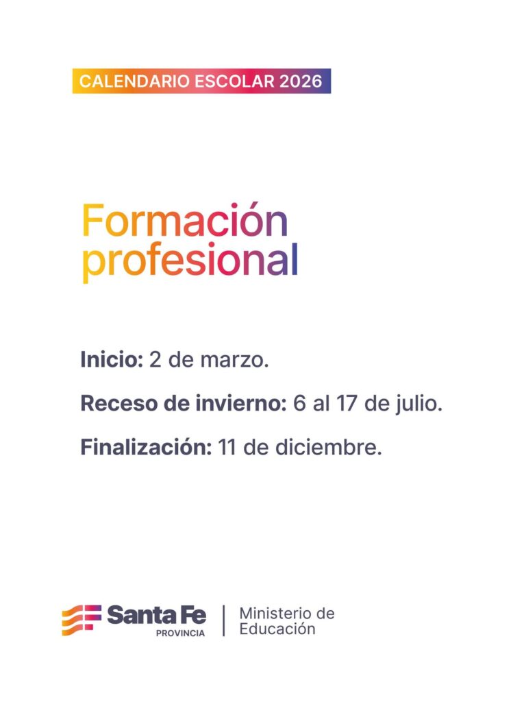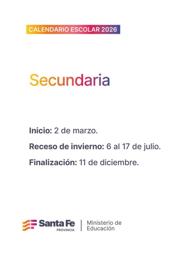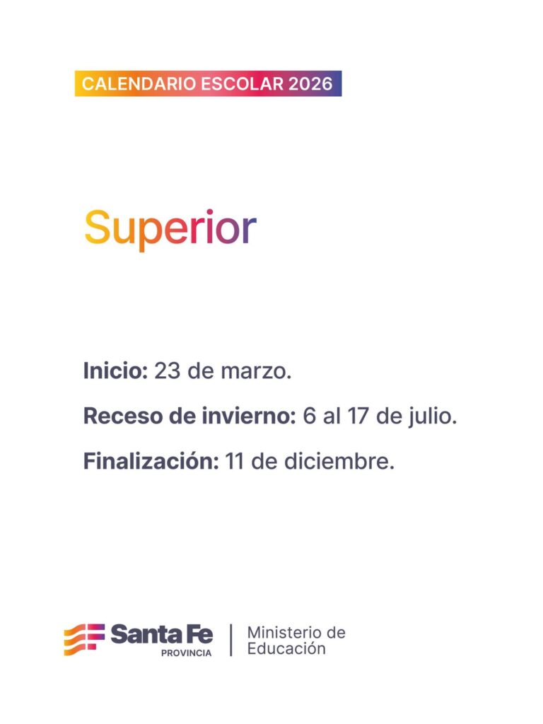 Los niveles secundario, superior y de formación profesional, en tanto, tendrán misma fecha de inicio del calendario escolar y receso invernal, pero finalizarán el 11 de diciembre de 2026.