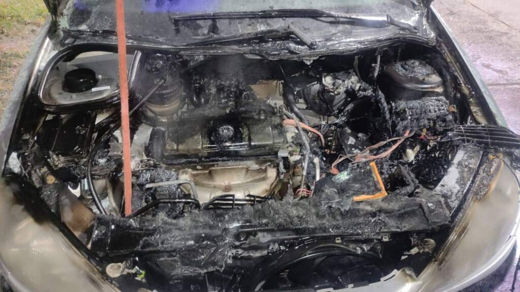 Tal como muestran las imágenes tomadas por personal de bomberos, el auto sufrió daños de consideración a raíz del foco ígneo desatado en el motor.