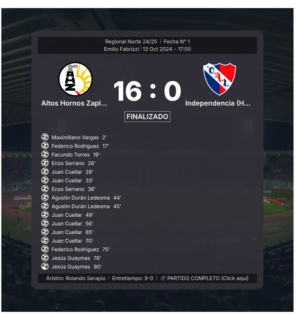 En Jujuy, Altos Hornos Zapla goleó a Independencia de Humahuaca por 16 a 0 en condición de local.