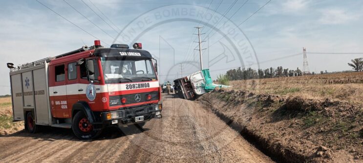 Bomberos Voluntarios de San Lorenzo realizaron tareas de prevención en el lugar, a la espera de una pala para recoger la carga y volver a estabilizar el camión.